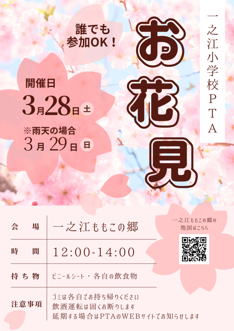 3/28(土)にお花見を行います。雨の場合は3/29(日)に開催します。